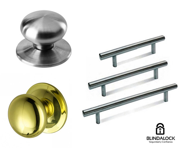 Tiradores para puertas tipo pomos ó tubulares, pomos disponibles en acero inoxidable o dorados.