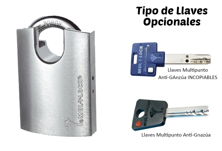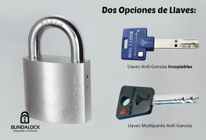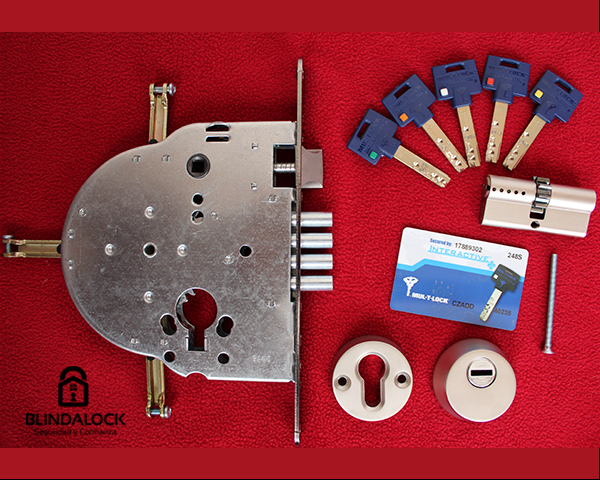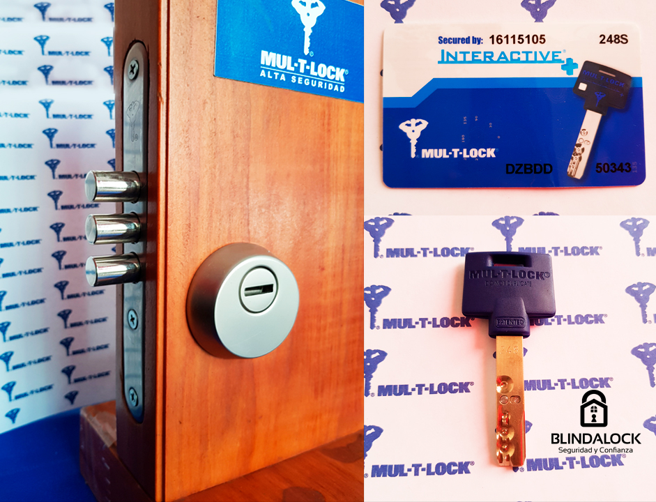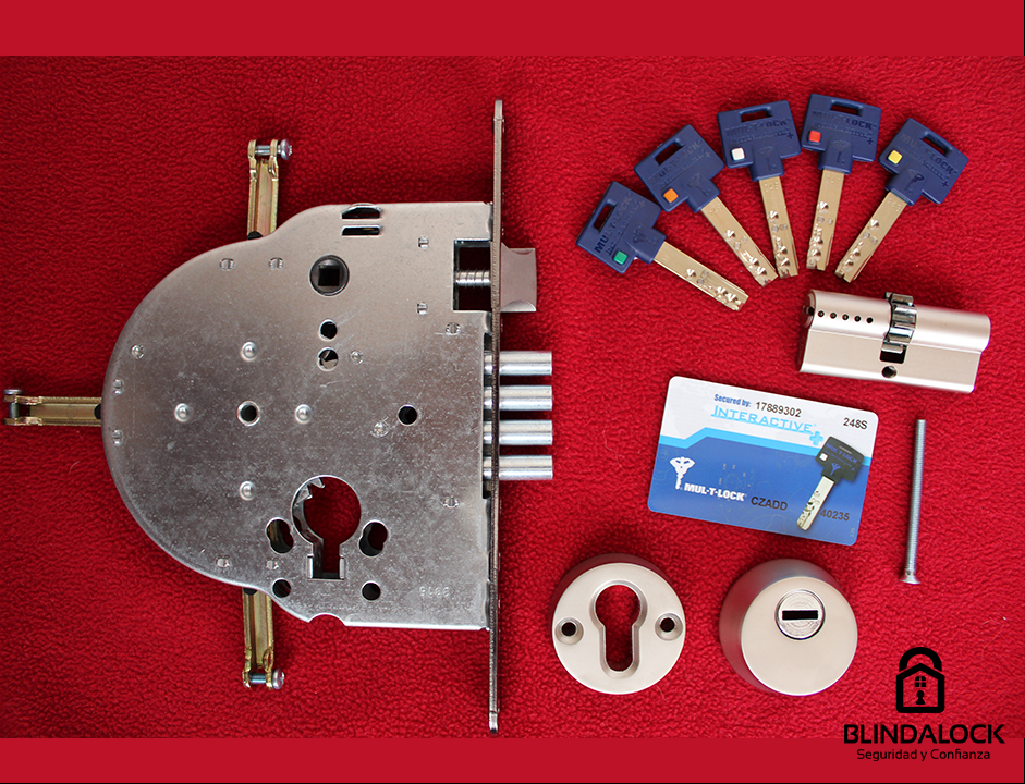 Cerrojo de alta seguridad con 7 puntos de anclajes. Cuenta con 5 llaves de copia restringida multipunto interactive + tarjeta para futuras copias.